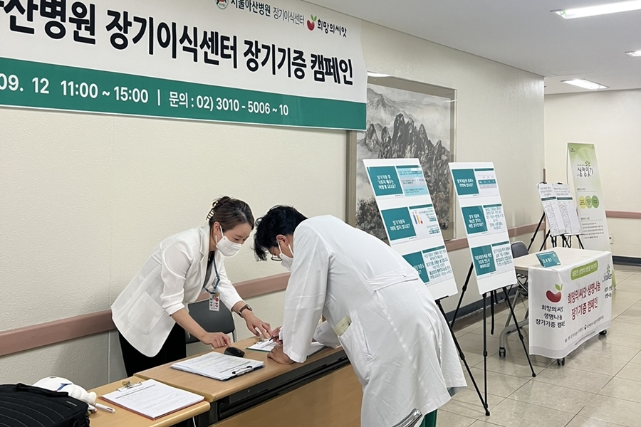 서울아산병원 병원 장기이식센터와 사단법인 생명잇기가 공동으로 주최한 제4회 장기기증 희망등록 캠페인이 9월 12일 동관 직원식당 앞에서 진행됐다. 장기기증 활성화와 인식 개선을 위해 마련된 이번 행사에는 우리 병원 직원 및 내원객 148명이 참여했으며 이 중 80여 명이 장기기증 희망 의사를 밝혔다. 현장에서는 장기기증의 의미와 절차를 안내하는 홍보물 배포와 함께 캘리그래피 전시, OX 퀴즈 등 참여형 이벤트가 진행됐다.