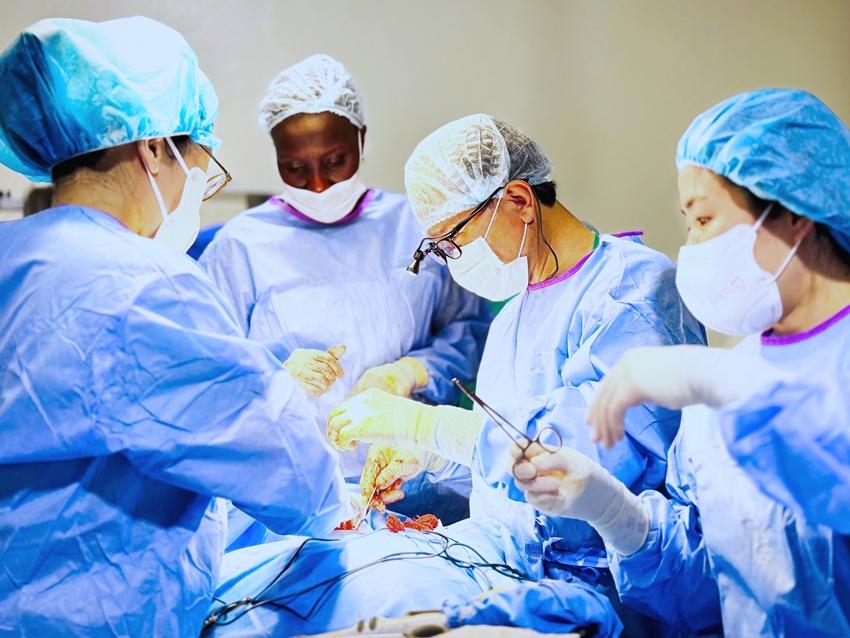 ▲서울아산병원 유방외과 손병호 교수(왼쪽 세 번째)가 현지 의료진과 함께 수술을 진행하고 있다.