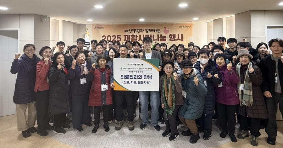 서울아산병원 재활의학과 직원들이 12월 6일 송파구 거여동에 위치한 송파구보건지소를 방문해 진료, 교육, 물품 기부 등을 하는 ‘재활 사랑나눔’ 봉사를 진행했다. 이번 행사에는 재활의학과 의사 8명을 비롯해 직원 30명이 참여했다. 직원들은 근골격 통증, 퇴행성 질환 등을 가지고 있는 취약계층 주민들을 진료하고 맞춤형 치료와 운동 교육 등을 진행했다. 또한 방한용품, 악력기 등 430만 원 상당의 물품을 전달했다.
