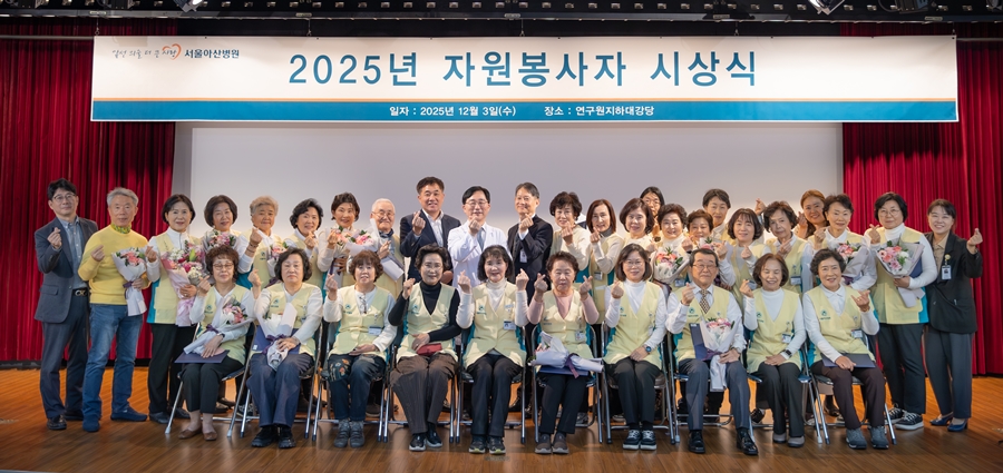 한 해 동안 서울아산병원을 위해 헌신한 자원봉사자들에게 감사의 뜻을 전하기 위해 마련된 자원봉사자 시상식이 12월 3일 연구원 대강당에서 열렸다. 자원봉사자 76명이 개근상을, 올해를 끝으로 은퇴하는 자원봉사자 9명이 은퇴봉사자상을, 500시간 이상 봉사에 참여한 봉사자 52명이 봉사시간상을 각각 받았다.