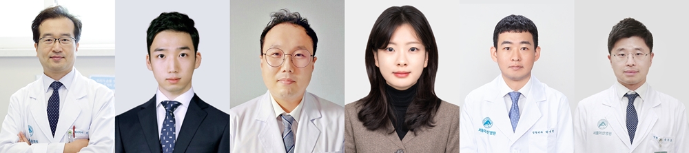 ▲(왼쪽부터) 서울아산병원 재활의학과 전재용 교수, 손우철 전문의, 천화영·여운하 박사, 정형외과 박세한·송주호 교수