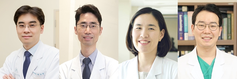 ▲(왼쪽부터) 소화기내과 박상형 교수, 류마티스내과 홍석찬 교수, 생화학분자생물학교실 이호수 교수, 마취통증의학과 이상욱 교수