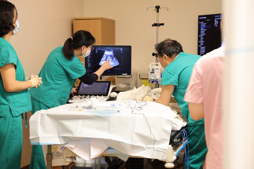 ▲ 산부인과 정진훈 교수(오른쪽)의 시술에 참여해 초음파 위치를 확인하고 있다.