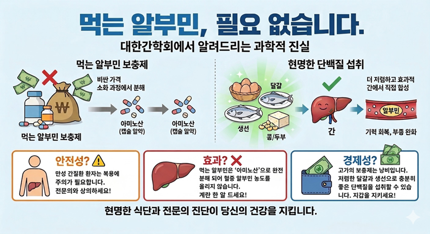간질환에서 중요한 질문은 ‘알부민을 무엇으로 채울까’가 아니라 ‘알부민 수치가 왜 낮아졌을까?’다. 복수가 생겼는지, 감염이 동반됐는지, 신기능이 나빠졌는지, 실제 영양 섭취가 부족한지 등 그 원인을 먼저 확인해야 한다. 알부민 수치가 낮다는 말을 들었을 때 가장 먼저 해야 할 일은 제품을 고르는 것이 아니라 그 수치가 왜 낮아졌는지 확인하기 위해 진료실을 찾는 것이다.