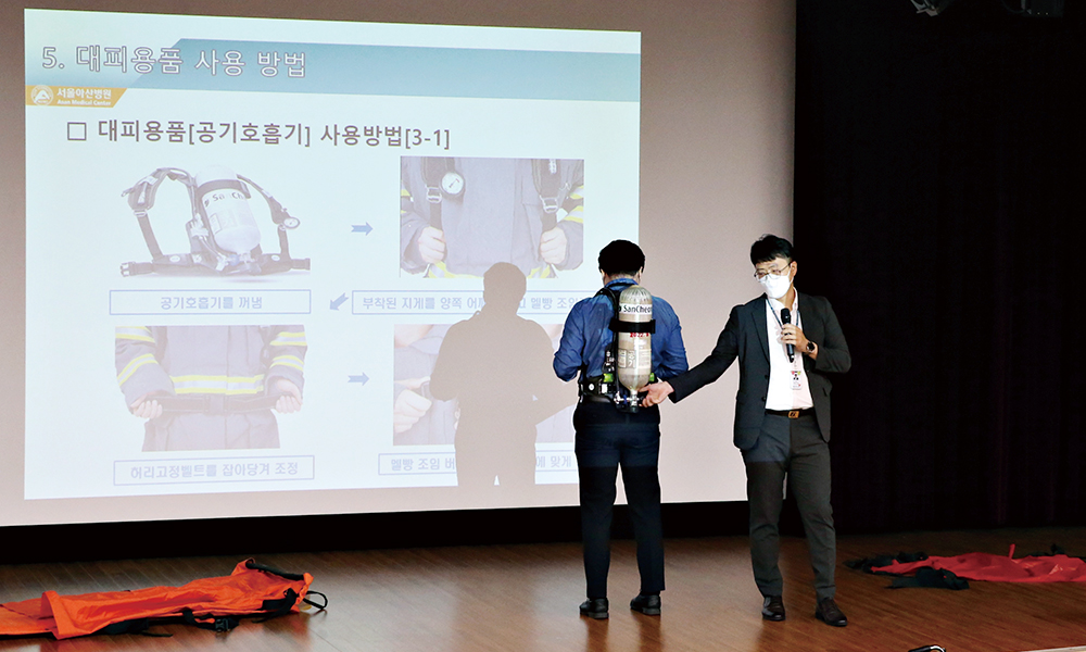 ▲ 아산생명과학연구원 대강당에서 진행된 초기/대피 지원반 소집 훈련에서 시설팀 김근섭 대리(오른쪽)가 대피용품 중 하나인 공기호흡기 사용법에 대해 교육하고 있다.
