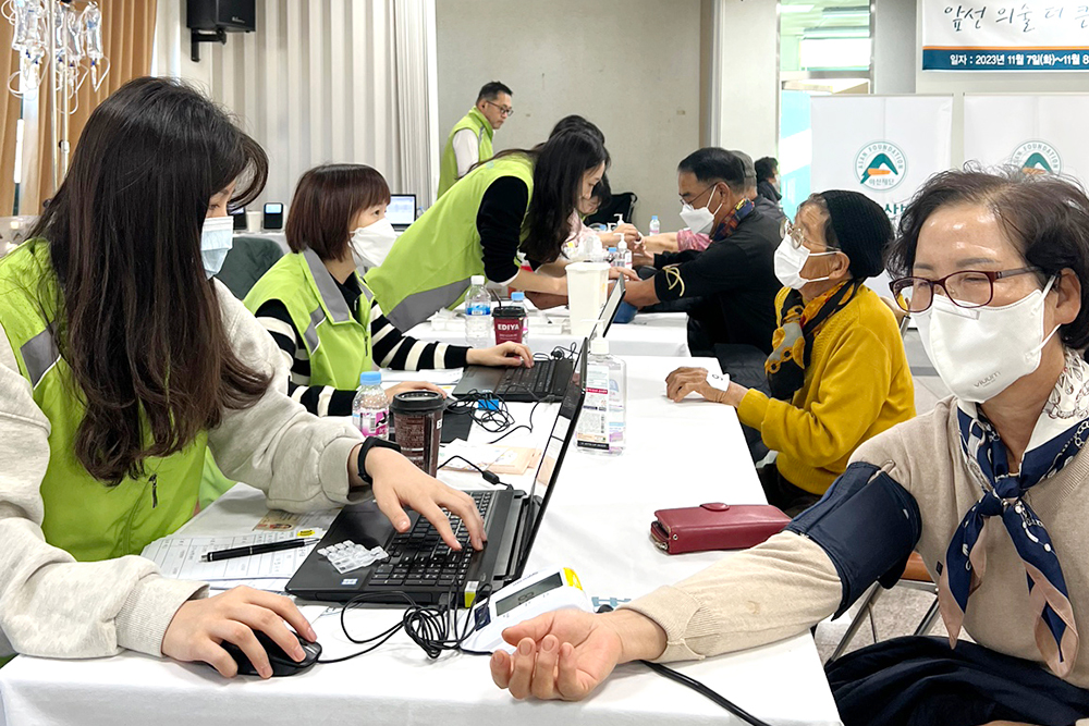 ▲ 서울아산병원 직원들이 강원도 평창군에서 진행된 의료봉사에 참여하고 있는 모습.